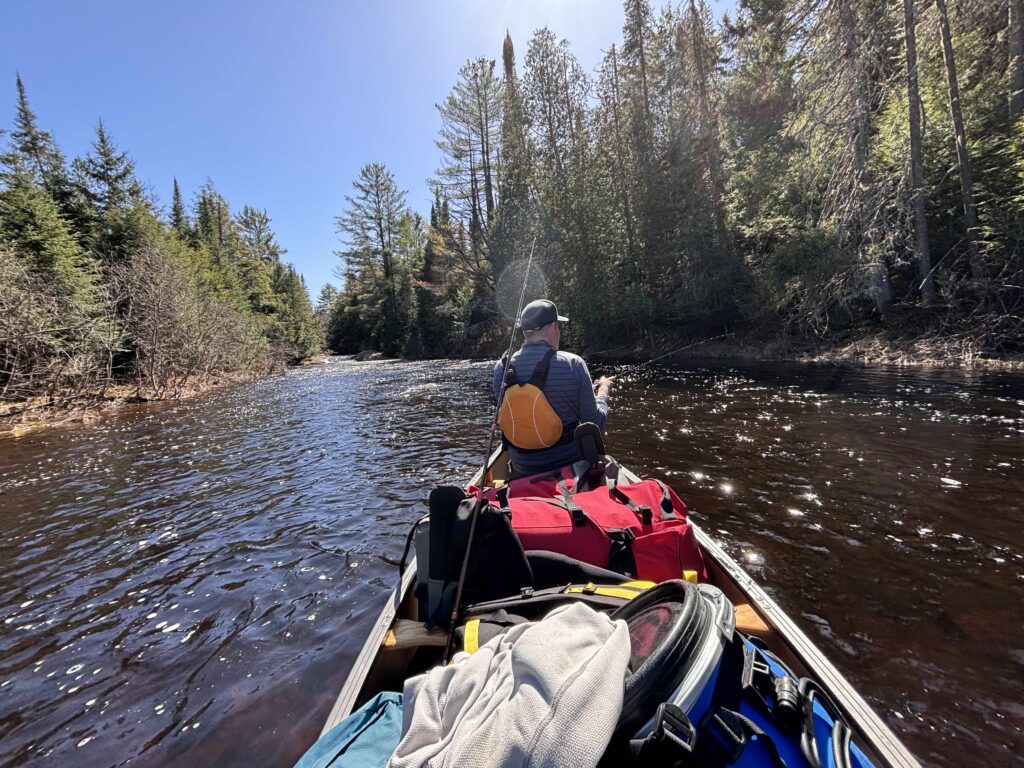 One of the highlights of a 5 – 13 day Algonquin Park canoe trip is the feeling of “leaving it all behind “. Paddling into Algonquin, I start to relax. The wind helps push us across the lake. The thousands of thoughts of busy days at work seem to be fading. An Offspray dives near b. The stress is evaporating with each stroke. The canoe flies accross the water. I am so excited to be heading out for a week. A 7-day backcountry Algonquin canoe trip that will take us to all the way down to Canoe Lake . I have paddled this river 100 times. Why do I find it more beautiful this time out? We hit the big Lake and the clouds open up for a warm afternoon sun. We set our lines. And to think, we have just started. This is going to be amazing.